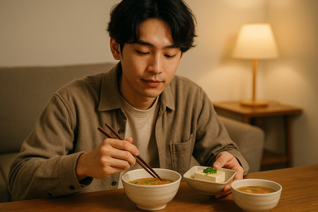 たとえば、豆腐にねぎとたれをかけた冷やっこ、ゆで卵とおにぎり、具沢山の栄養スープ、またはプロテインを豆乳で割ったものなど。どれも手軽で、夜遅くでも安心して口にしやすい選択です。