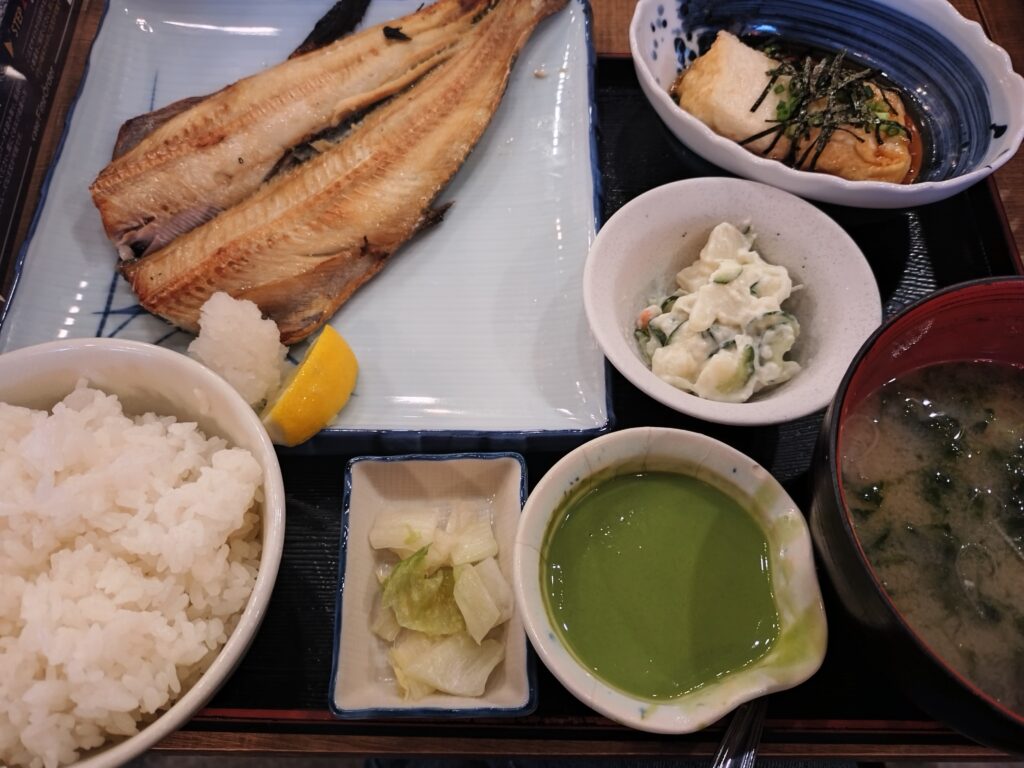 私はホッケ焼き定食を注文。税込み1,209円でこのボリュームは最近の物価高ではありえないほどオトクです。ちなみに海苔汁ではなく、とろろうどんも選択でき、ご飯の量も選べます。こちらの写真は普通盛りですが、普通のお店の大盛ぐらいの量があったので、小食の方は少なめでも十分だと思います。