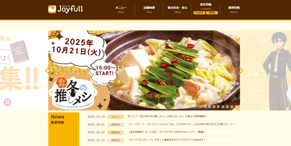 季節フェアも充実しており、例えば2025年秋冬フェアの「食欲の秋山(2025年9月30日~)」や2025年冬フェア「ぽかぽか冬の推しメシ(2025年10月21日~)」 といった食欲をそそるメニューも展開しています。