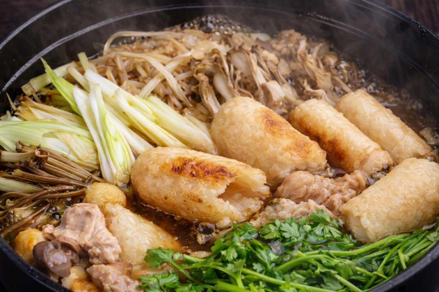 鍋として食べられるようになった背景には、寒さの厳しい秋田の気候があります。鶏肉や根菜と一緒に煮込むことで体が温まり、主食とおかずを兼ねた食事として、家庭や集まりの場で定着していきました。現在では、比内地鶏のだしを使うなど、地域性を生かした味わいが特徴として知られています。