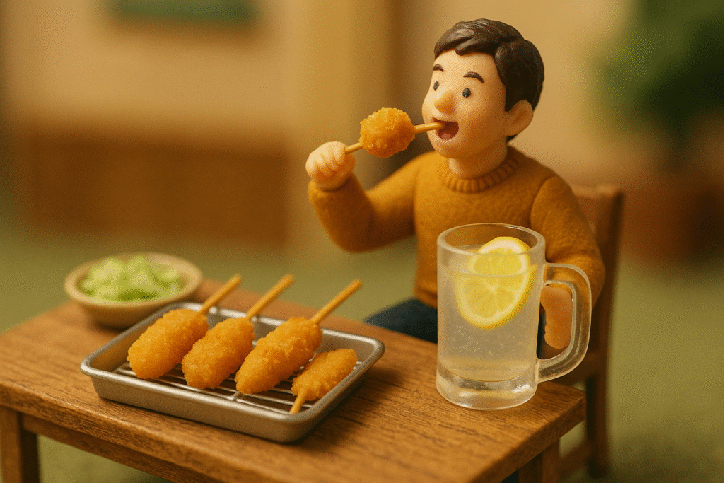 一人飲みでは、串カツを数本ずつ注文して揚げたてを味わいながら、少しずつお酒を進めるのが理想的。量を調整しやすく、初めての人でも「ちょっと一杯」から気軽に楽しめるのが、串カツ田中 一人飲みの魅力です。