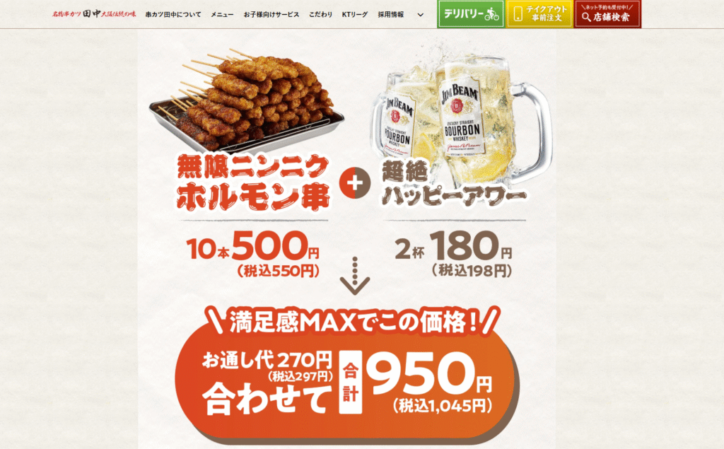 さらに注目なのが、現在キャンペーン中の「無限ニンニクホルモン串」。1本なんと50円(税込)という破格で提供されており、ビールやレモンサワーとの相性も抜群。串カツ田中ならではのガツンとした味わいで、“安くてうまい”を体感できます。