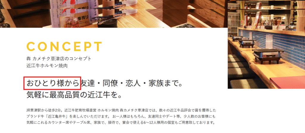 | 特徴 | 駅近・一人利用口コミあり・系列店多数 |