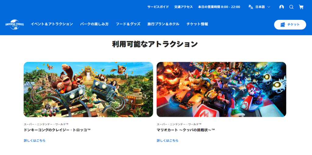 | ドンキーコングのクレイジー・トロッコ | 約120分~200分 | 約80分~180分 | 今一番人気のアトラクション。 |